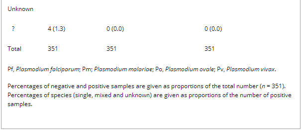 Species identification by microscopy was not possible in four cases, although parasites were seen. PCR analysis revealed Pf (n = 1), Pv (n = 1) and Po (n = 2) in those samples.