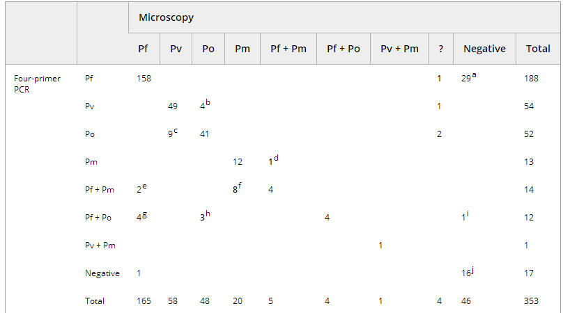 Table 4 shows the four-primer PCR and microscopy results. Single species identifications showed concordant results for 158 Pf, 49 Pv, 41 Po and 12 Pm samples. In nine microscopically detected mixed infections, DNA of the same two species was co-amplified (four Pf + Pm; four Pf + Po; one Pv + Pm). Sixteen HRP-2-positive samples were negative by both PCR and microscopy (Table 4, footnote j).