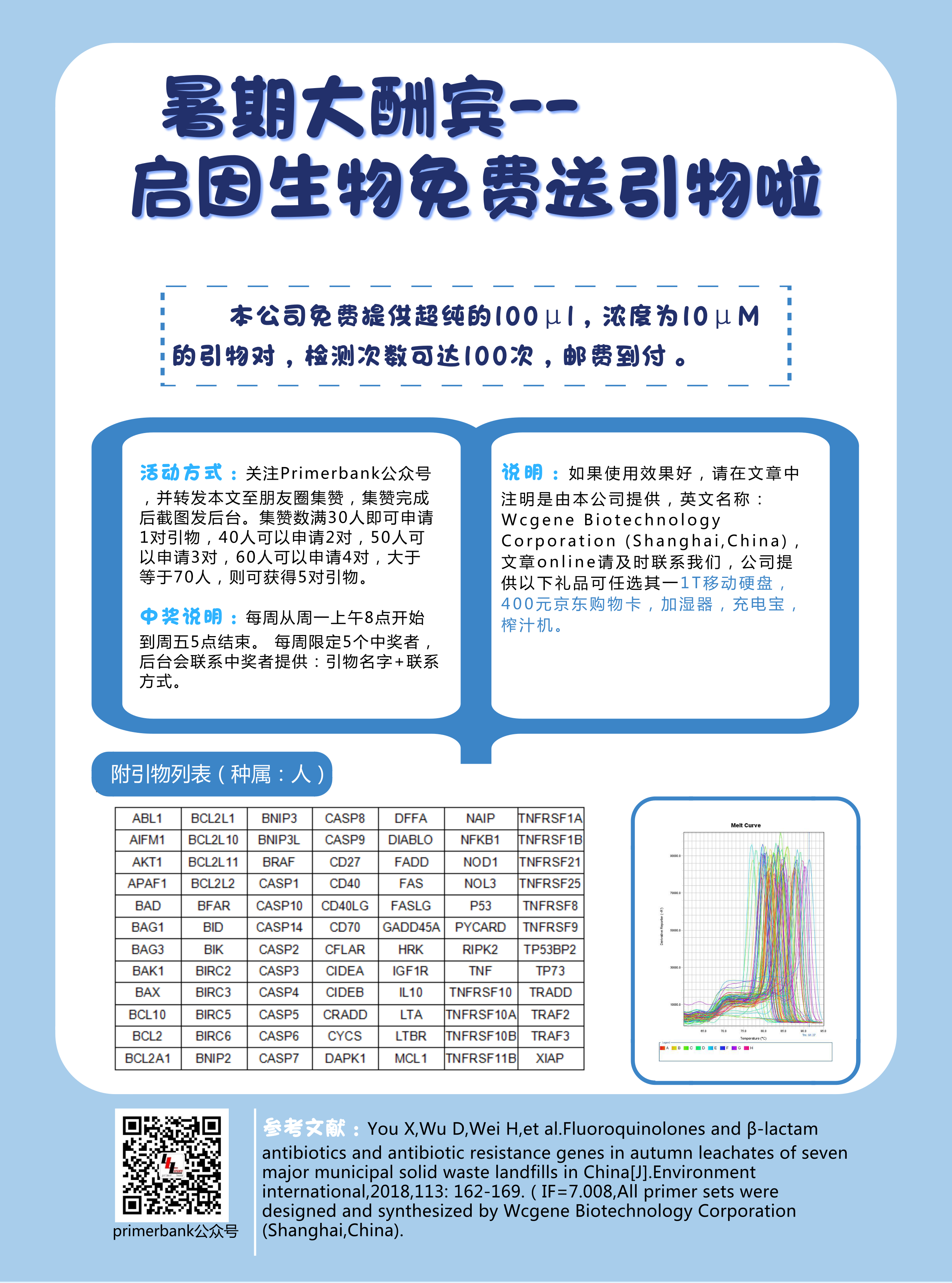活动方式:关注Primerbank公众号,并转发本文至朋友圈集赞,集赞完成后截图发后台。集赞数满30人即可申请1对引物,40人可以申请2对,50人可以申请3对,60人可以申请4对,大于等于70人,则可获得5对引物。