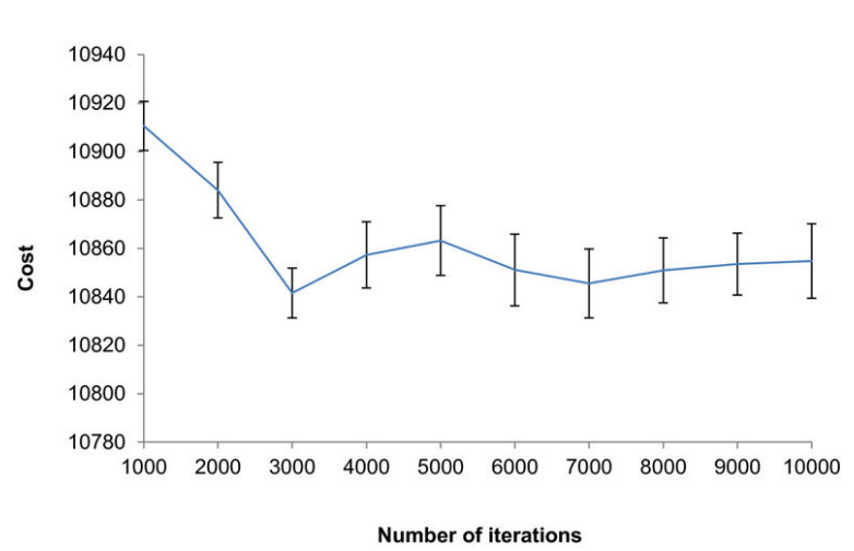 Cost results of MCMC-ODPR over 10,000 optimizations. The program was run 1000 times, with the first 100 being run to 1000 iterations, the second 100 run to 2000 iterations and so on until 10,000 iterations was reached. A dataset of 30 FASTA sequences was input, with no SNP processing specified and a melting temperature of 60 degrees centigrade only.