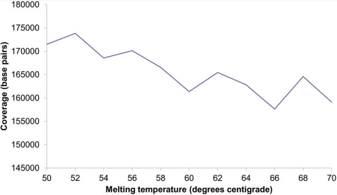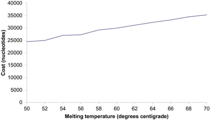 The same underlying algorithm as Primer 3 was compared with MCMC-ODPR with multiple sequences using BatchPrimer3, and the comparison with PAMPS allowed us to compare the capability of MCMC-ODPR to design reusable degenerate primers in terms of cost. A subset of 184 sequences was used from our list of 247 genes because of a limitation in PAMPS, which is restricted to sequences of 2000 base pairs or less. All sequences over 2000 base pairs were therefore removed. This subset was used for all three programs. BatchPrimer3 was used with the same default values for melting temperature and product size as with Primer3. BatchPrimer3 allows the user to input the desired number of primers to be returned per sequence, therefore for this value we chose the highest number of primers returned for all sequences by MCMC-ODPR, which was 10 primers. The analysis was performed first with allowing no difference in Tm between primer pairs for the BatchPrimer3 algorithm, as no difference in Tm is permissible with MCMC-ODPR, and then allowing the default Tmdifference of 10 degrees centigrade between pairs. When no Tm difference was input to Batchprimer3 the sequence coverage of BatchPrimer3 was 29.7% with the total sequence coverage of MCMC-ODPR at a Tm of 60 degrees centigrade being 77.4% (Table 4). The cost of the primers designed by Batchprimer3 was 15,427 nucleotides, approximately half the cost of 30,103 nucleotides yielded by MCMC-ODPR, however, the coverage yielded was just over one third of that achieved with MCMC-ODPR. MCMC-ODPR achieved a lower cost per unit coverage than BatchPrimer3 of 0.19 compared with 0.25. When a maximum difference of ten degrees centigrade was allowed between primers for BatchPrimer3 it achieved a sequence coverage of 39.6% at a cost of 13,462 nucleotides, yielding a cost per coverage of 0.16 (not shown). Despite the lower cost of BatchPrimer3 in this case, MCMC-ODPR still achieved a greater sequence coverage and summary cost per unit coverage value close to that of BatchPrimer3 with the added constraint that MCMC-ODPR only designed primers with no difference in Tm.