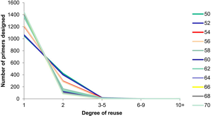 Algorithms for implementing primer reuse have also been developed: Doi and Imai have described a heuristic algorithm for greedy primer design within multiplex PCR, which attempts to minimize the cost of primers required for multiplex PCR and SNP genotyping[8]. MuPlex is another heuristic algorithm designed for multiplex PCR, which uses a graph based approach to assign the largest number of non-conflicting primers into the fewest ‘cliques’ that can be assigned to multiplex PCR tubes[9]. Lui and Carson have utilized a simulated annealing optimization to maximize primer reuse, which exhaustively searches primer space and aims to converge upon the optimal cost solution[10]. Despite individual cost benefits from either optimization of primer reuse, or automated design of degenerate primers, combining the two techniques is likely to offer additional cost advantages.