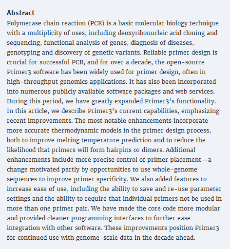 Since we first released Primer3, the fields of bioinformatics, genomics and molecular biology have expanded rapidly, and the amounts and types of sequence data that biologists collect and process are vastly greater and more diverse. In addition, the field has developed more accurate algorithms for predicting the hybridization behavior of nucleotide sequences. These changes have provided opportunities to improve Primer3’s functionality: