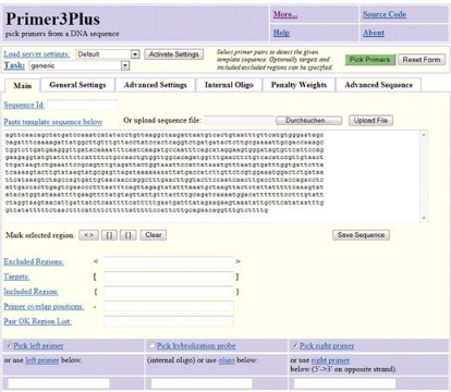 Primer3 has two web interfaces—the original web interface, Primer3web, and the newer Primer3Plus (22), which is designed to be an easier-to-use, task-oriented interface that still harnesses the full power of Primer3. Primer3Plus offers several tabs from which all Primer3 parameters are accessible, including the new parameters controlling the thermodynamic models for secondary structure and those providing precise control over possible primer locations (Figure 2). We have set the parameters in Primer3Plus to reasonable default values, which should allow occasional users to design working primers by simply providing a template DNA sequence in the first tab of the web interface and clicking the ‘pick primers’ button. Experienced users can adjust arguments presented through the remaining tabs to exert fine control over the primer selection process.