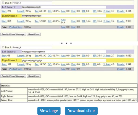 Since its initial release, Primer3 has become extremely popular. It was downloaded >20 000 times during 2011, and >7000 manuscripts reference the original publication (Google Scholar). Primer3 likely owes its popularity to several factors that include the availability of a relatively easy-to-use web service, robust engineering, open access to the program source code, suitability for use in high-throughput pipelines for genome-scale research and the ease with which Primer3 can be incorporated into or interoperate with other software. Supplementary Table S1 lists >25 third-party software tools and web services that incorporate Primer3. Primer3’s popularity also likely stems from its ability to meet the needs of three groups of users: (i) bioinformaticians, who embed Primer3 within their web services, bioinformatics scripts or pipelines, (ii) expert users who select large numbers of primers and need tight control over the selection process and (iii) occasional users who simply want a convenient way to design a few primer pairs. Bioinformaticians usually rely on the Primer3 command-line interface and run Primer3 on a local machine. The other users, whether ‘expert’ or ‘occasional’, usually rely on Primer3’s web interfaces.