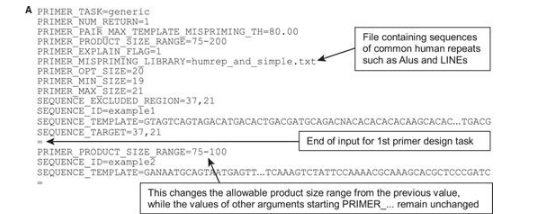 For easy integration of primer3_core with other software, the boulder IO input tags must be straightforward to create, and the output tags must be straightforward to interpret by other programs or scripts. To this end, we have systematized tag names throughout the program. In particular, tags providing information specific to the current template sequence start with ‘SEQUENCE_’ (Figure 4A) and only have effect for a single primer design task; tags providing global information required for primer selection start with ‘PRIMER_’ and are active until they are over-ridden. We have also systematized the structure of the output tags to ease automatic parsing.