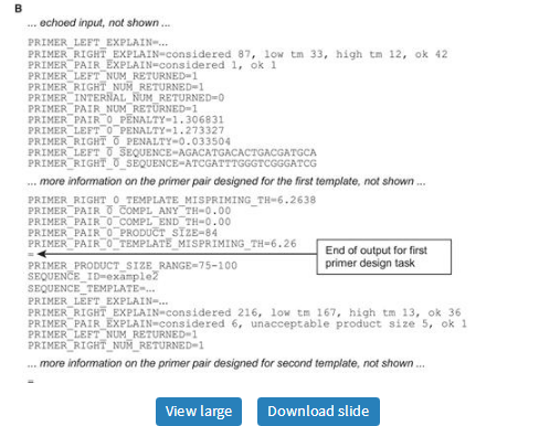 Because the primer3_core program accepts >150 parameters and long template sequences—far too much information to be supplied on the command-line—it reads most of its inputs from flat text files. Specifically, primer3_core uses the ‘boulder IO’ (boulder input-output) format, in which each parameter name (termed a ‘tag’) and its corresponding value are joined by an '=' sign, with one tag and its value per line (Figure 4). A single input file can specify multiple primer design tasks: the inputs for individual design tasks are separated by lines consisting only of an '=' sign. Primer3_core also generates its output in boulder IO format (Figure 4B). This format is designed for integration with other software, including scripts and web services, on the assumption that end users will interact with the web interfaces.