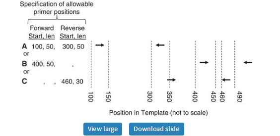 · Forward primer in the 50 bp region starting at position 100 and reverse primer in the 50 bp region starting at position 300.