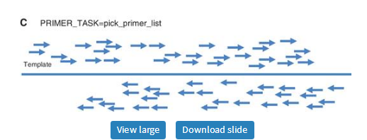 · pick_sequencing_primers: Pick multiple unpaired primers for Sanger sequencing reads that will cover the template (Figure 8B). The spacing between successive forward primers and successive reverse primers is governed by arguments (described in the manual, http://primer3.sourceforge.net/primer3_manual.htm), but as the primers are designed to prime Sanger sequencing reactions, forward and reverse primers are not paired. This is different from selecting primer pairs to ‘tile’ a large region with PCR products for subsequent sequencing, which Primer3 does not offer [although the PCR Suite (10) layers this capability on top of Primer3.]
