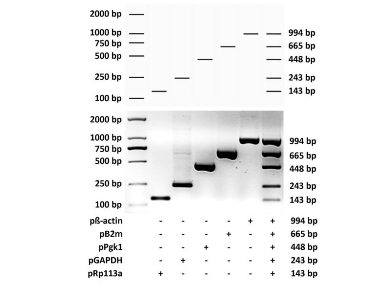 Diagram showing the three letters "P", "C" and "R" by experimentally validated electrophoretogram using the primer set combination (PSC) designed by MPprimer for five mouse genes (β-actin, B2m, Pgk1, GAPDH and Rp113a). The three letters "P", "C" and "R" were shown in both a virtual electrophoretogram predicted by MPprimer (top panel) and the experimentally validated electrophoretogram (middle and bottom panels). The plus sign indicates the use of the primer set.