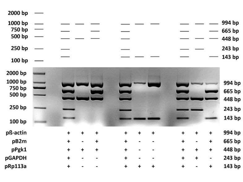 To examine the performance of MPprimer, we designed a PSC comprising 5 PSs (10 primers) to amplify five mouse genes (β-actin, B2m, Pgk1, GAPDH, Rpl13a) in one tube as a typical multiplex PCR reaction. The result of the real experiment was nearly the same as that predicted by the virtual agarose gel electrophoresis analysis (Figure 3 and Figure 4). The homepage of MPprimer describes the detailed information of the experiment including the templates sequences, primer sequences, and the PCR and electrophoretic conditions. As another example, we have successfully used MPprimer to design the multiplex PCR primers for DMD (dystrophin gene which caused Duchenne Muscular Dystrophy), which has 79 exons, for 20×, 20×, 20×, 14×, and 5× plex PCR reactions in five tubes to detect underlying exon deletions (see homepage of MPprimer for details).