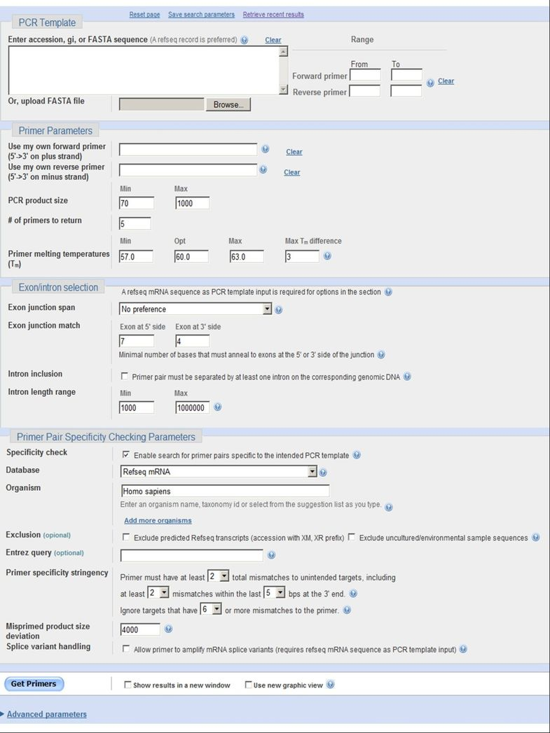 Other options, including parameters for BLAST search sensitivity, SNP exclusion and primer properties, etc. can be found under the “advanced parameters” section.