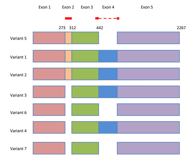 Examination of the alignment of transcript variant 5 with other variants indicates that the existence of exon 2 and absence of exon 4, when combined, are the only features that distinguish it from the rest (Figure 2). Not surprisingly, part or all of the forward primers picked by Primer-BLAST are located in exon 2 and all reverse primers are on the junctions between exon 3 and 5 (since exon 4 is not present).