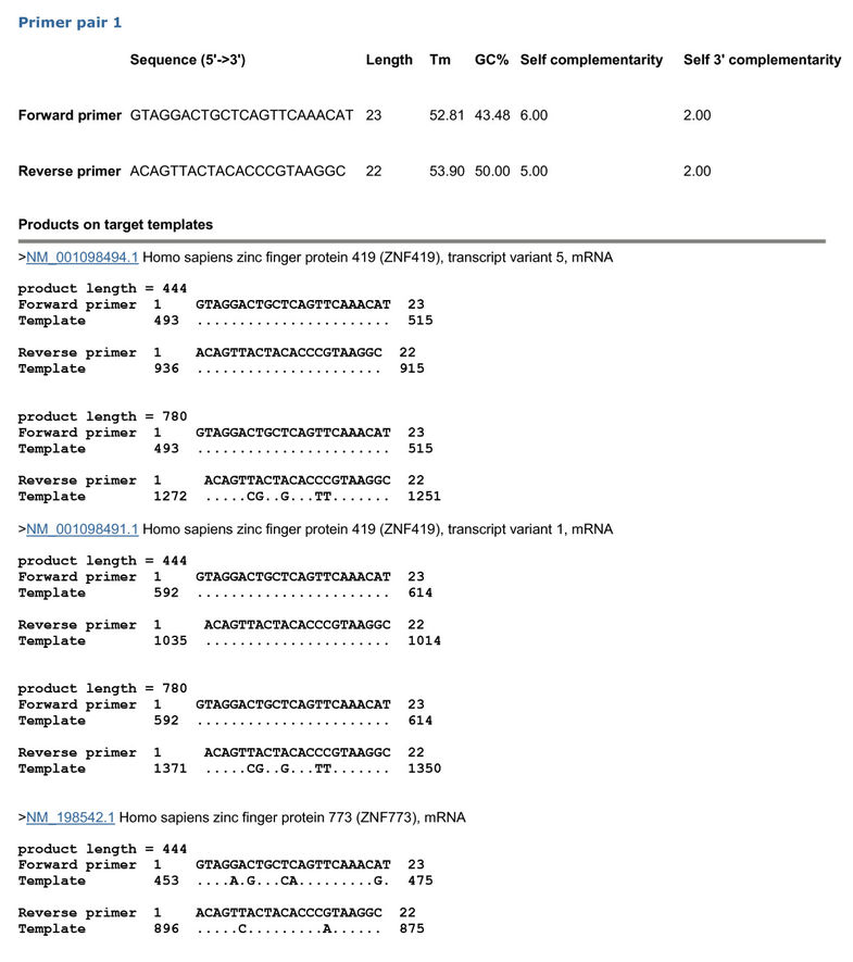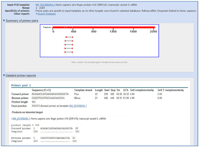 As an example to illustrate the functionality of Primer-BLAST, we design primers using the human zinc finger protein 419 (ZNF419) transcript variant 5 mRNA (Genbank accession NM_001098494). As shown in Figure 2, there are seven transcript variants for the ZNF419 gene according to the NCBI Gene report. The search used default values that require at least one primer (for a given primer pair) to have two or more mismatches to unintended targets in the last five bases at the 3’ end. The specificity checking was performed against the NCBI RefSeq mRNA database with organism limited to human, since the goal was to find primer pairs that are specific to this transcript only among the human transcriptome. To avoid possible genomic DNA amplification, the option “Primer must span an exon-exon junction” is selected. As shown in Figure 3, Primer-BLAST successfully returned five specific primer pairs and the detailed alignment between targets and primers are shown. During the search process, Primer-BLAST examined a total of 355,744 BLAST matches (see Figure 3 legend) that represent not only the transcript variants of this gene but also a large number of transcripts from other genes that show matches of varying degrees to the candidate primers. This underscores the challenge if the same thorough examination of primer specificity task were to be performed manually. The average search time for designing new primers with default parameters using a human mRNA template of average length (2800-3000 bases) is 2.6 minutes.