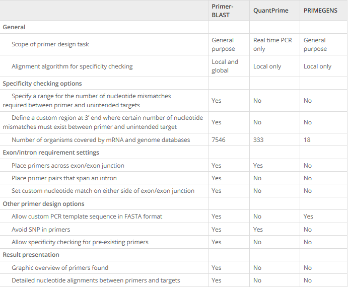 Primer-BLAST offers a number of features that are not available in other software tools. Table 1 gives a brief summary of these features, many of which are important for various primer design requirements and allows examination of primer specificity details by users. For example, Primer-BLAST is the only tool that offers the ability to specify the number of mismatches that a specific primer pair must have to unintended targets and a custom 3’ end region where certain number of mismatches must be present. This option is important to meet different primer specificity stringency requirements by users, since the specificity of a primer is typically judged by the number of mismatches it has to unintended targets (higher number of mismatches offer more specificity) and the locations of such mismatches (mismatches closer to 3’ end offer more specificity). Primer-BLAST is the only program among the three that will place primers on different exons (i.e., to span an intron) to avoid amplification of genomic DNA and also the only one to allow customization of the number of nucleotide matches on either side of an exon/exon junction. Furthermore, Primer-BLAST presents detailed alignments between the primers and targets found.