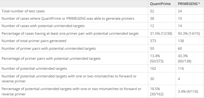 The test templates are randomly selected from NCBI Refseq mRNA database and they include 52 human sequences for testing QuantPrime and 24 Arabidopsis thaliana sequences for testing PRIMEGENS (since PRIMEGENS does not support human sequences). As shown in Table 2, QuantPrime or PRIMEGENS generated primer pairs for most test cases that they deemed to be specific for input templates. However, Primer-BLAST revealed that many of these (13.4% of primer pairs from QuantPrime and 43.3% of primers pairs from PRIMEGENS) have potential unintended targets that show between one and five nucleotide mismatches. As a result, a large portion of test cases have at least one primer pair that has potential unintended targets (31.5% for QuantPrime and 93.3% for PRIMEGENS). Some targets have only one or two mismatches to primers generated from QuantPrime (18.5%) although this portion is much smaller for PRIMEGENS (3.4%).