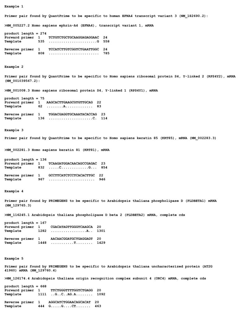 Examples of potential unintended targets for primer pairs generated by QuantPrime and PRIMEGENS. Example targets are extracted from Primer-BLAST specificity checking results for primer pairs generated by QuantPrime or PRIMEGENS (a total of 162 and 116 potential unintended targets were identified for QuantPrime and PRIMEGENS, respectively. See Table 2 for details). The example primers correspond to those underlined in Additional files 1 and 2.