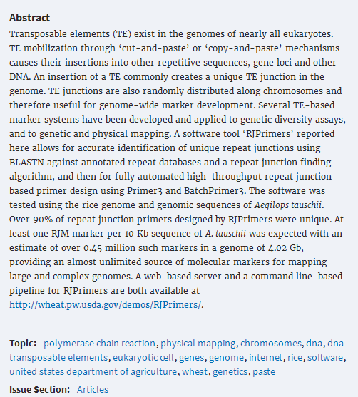 The command line-based pipeline provides the capability to process a large amount of sequence data without memory and network speed limitations. The user-defined repeat databases can be integrated into the RJPrimers pipeline if the databases are recompiled into the RJPrimers- required format (see online user’s manual). The parameters for repeat junction identification and primer design need to be set up in the pipeline program before execution. All output files are saved in a directory for each execution. The command line-based programs and user’s manual together with recompiled repeat databases can be downloaded from the RJPrimers website at http://wheat.pw.usda.gov/demos/RJPrimers.