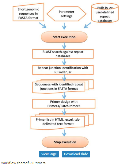 The web server of RJPrimers consists of a set of CGI-based programs written in Perl and a Java program ‘RJFinder’, which can run on Linux or Solaris operating system using an Apache HTTP server and Perl interpreter program. A user friendly interface similar to that of BatchPrimer3 (18) was applied to provide users with a sequence input mechanism, repeat database selection, and flexible parameter settings for junction identification and primer design. A total of 16 repeat databases, including RepBase, MIPS REdata, TREP, maize TEDB and 12 TIGR plant repeat databases, are available. More repeat databases can be easily embedded into the web application and the databases can be periodically updated if new repeat sequences are compiled into the databases. The Primer3 core program (19) was employed to pick the best pairs of standard PCR primers and an additional primer-picking algorithm in BatchPrimer3 (18) was included to select position-restricted primers like repeat junction flanking primers in RJM.