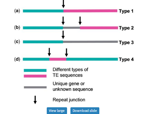 Repeat junction types in a short sequence. (a) Type 1: a repeat junction between two different TEs. (b) Type 2: two repeat junctions involving two different TE and an unknown or gene sequence. (c) Type 3: a repeat junction with a TE in one side and a fragment of an unknown or gene sequence on the other side. (d) Type 4: a nested repeat junction caused by a TE inserting into another TE.
