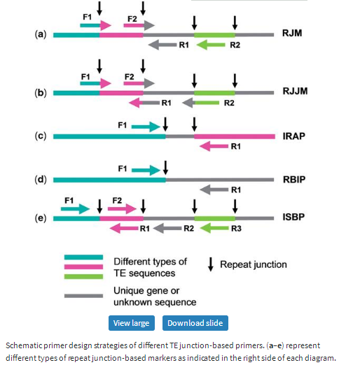 Transposable elements (TE) make up large proportions of many eukaryotic genomes. For example, they represent ∼35% of the rice genome (1), and ∼90% of hexaploid wheat genome (2) and significantly contribute to the size, organization and evolution of plant genomes. Based on the mechanism of transposition, TEs are classified into two major classes on the basis of the mechanism of transposition (3): Class I retrotransposons which transpose through ‘copy-and-paste’ mechanism, and Class II DNA transposons which transpose through ‘cut-and-paste’ mechanism. Their frequent amplification and transposition causes random insertion of TEs into other TE, gene or other DNA sequences, creating specific junctions between the newly inserted TE and surrounding sequences. Those TE or repeat junctions are commonly unique and genome-specific. They can be therefore treated as single copy markers in the genome (4,5). The genome specificity of TE junction-based markers makes them particularly useful for mapping of polyploid species including many important crops, such as wheat and cotton. Because repeat junctions are also abundant and randomly distributed along chromosomes (5), they have a great potential in development of genome-wide molecular markers for high-throughput mapping and diversity studies in large and complex genomes (5,6).