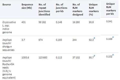 Aegilops tauschii repeat junction categories differed from those in rice (Table 2). Most of the repeat junctions in A. tauschii involved retrotransposons rather than DNA transposons, as was the case in rice. This is because 75% of repeat reads are retrotransposons based on repeat annotation in the ∼0.3� A. tauschii genome coverage produced by Roche 454 reads. Although the two grass species differ in frequencies of repeat junction categories, they both have a similarly high level of unique repeat junctions and RJM primers.