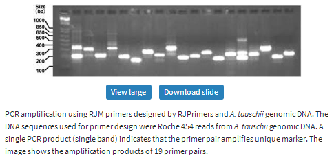 Wet lab PCR amplification of RJM primers designed by RJPrimers from Roche 454 reads and Sanger shotgun sequences of A. tauschii