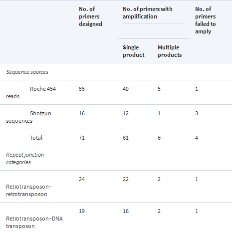 Abundance and uniqueness of repeat junctions and RJM primers