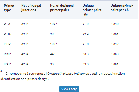 TE junctions can be easily converted into PCR-based markers (11). A total of 16 280 primer pairs (28%) were designed from 59 182 rice repeat junctions and 90.8% of RJM primers or 0.041 primers per Kb were unique, as indicated by single in silico PCR products (Table 1 and Figure 4). The in silico PCR could help users evaluate the uniqueness of RJ markers generated in the targeted genome provide the genome sequence information is available. Taken together, we can expect to produce at least four unique sets of RJM primer pairs per 100 Kb in genomes with repeat content similar to that of rice. Not all repeat junctions can be used for RJM primer design due to certain primer design restrictions. Approximately 30% of junctions identified from rice and A. tauschii were usable since high stringent cutoff values were imposed on PCR primer design parameters as default in RJPrimers in order to increase the success rate of PCR amplification.