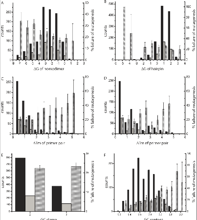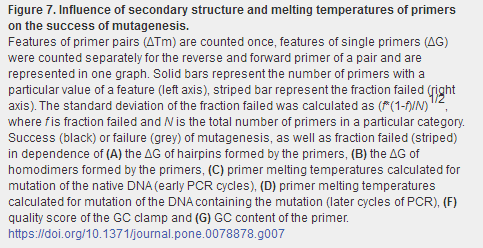Here, we evaluate whether the success of mutagenesis depends on the thermodynamic stability of the primers used to generate the mutations. We used data from alanine scans of two complete proteins, arrestin, 404 residues, and Galphai1, 354 residues long. The primers generated by the AAscan program were used for mutagenesis as described above, introducing one alanine or glycine mutation at a time. Mutations were classified as successful if the mutation was obtained with this technique using the first set of primers given by the program. It is generally assumed that secondary structure of the primer, notably homodimers and hairpins, may interfere with the efficiency of the PCR. The Gibbs energy of the most stable homodimer and hairpin, respectively, as well as the thermodynamic melting temperature (Tm), which depends on the GC content of the primer, was calculated for all 758 forward and reverse pairs of primers (Figure 7).