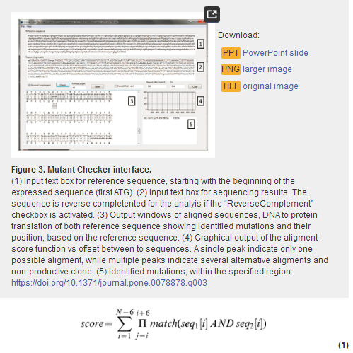The amount of sequencing results needed to be analysed stimulated the development of a software to align and identify mutations semi-automatically (Figure 3). Mutant checker is a software designed to align and identify mutations semi-automatically which facilitates analysis of large numbers of sequencing results. It aligns the sequencing results to the reference sequence using an empirical likelihood function. This a number of perfect matches in a sliding track of 7 nucleotides along the whole length of reference sequence. This function (Eq. 1) does not allow gaps, as we are looking only for mutations, and not deletions or insertions.