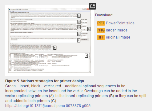 The software designs primers to amplify the vector and the insert. It subsequently adds the desired inclusions and the required 15 bp overlaps needed for homologous recombination. It offers the user several options of primer pair design which may be advantageous in different situations (Figure 5). When cloning several different inserts into the same vector, it makes sense to have a primer pair for vector amplification and various primer pairs for amplification of the inserts. The opposite would be desired if the same insert was cloned into different vectors. In a third case, where due to the insertion of the relatively long additional DNA sequence the primers are long, and may be advantageous to have a balanced length of primers due to the technical difficulties of producing very long primers. In this case, four primers of balanced lengths would be advantageous when primers with long additional DNA sequences are designed.
