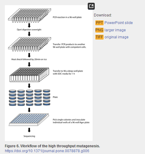 We have used the E.coli strain Mach1 for all DNA manipulations. The chemically competent cells had an efficiency of >107 colonies/µg of pBR322 DNA for reliable results. Transformation steps were also optimized by adding 4 µl of PCR product into another 96-well microplate filled with 50 µl Mach1 cell suspension. After 25min on ice, the mixture was incubated in the PCR machine at 42°C (heat shock) for 45 s and then placed back on ice for 2min. The transformed cells were then transferred to a 96 deep-well plate filled with 600 µl S.O.C. media and incubated at 37°C for 2 h. 100 µl of 650 µl samples were plated on LB agar plate with appropriate antibiotics and incubated at 37°C overnight. A single colony of each mutant was transferred into a 96 well Agar plate with appropriate antibiotics and sequenced by the GATC Biotech Company (Figure 6).