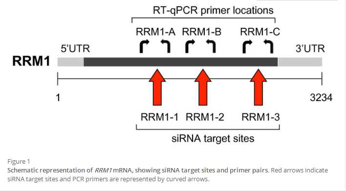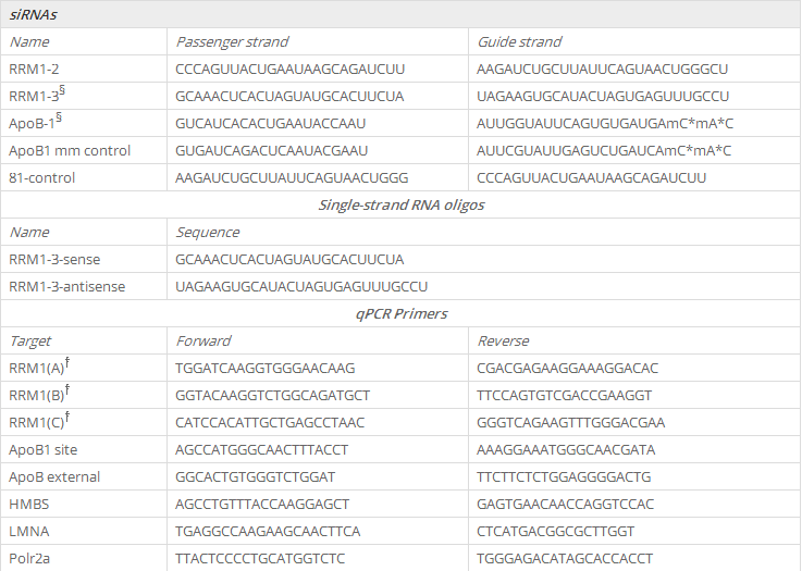 * Represents phosphorothioate linkages between nucleotides in the siRNA backbone. † Targets RRM1-A, B and C represent the cleavage sites for the various RRM1-specific siRNAs, as shown schematically in Figure 1A. §RRM1-3 and ApoB1 are complementary in sequence to both human and mouse target genes. Accession numbers: RRM1, NM_001033.3; LMNA, NM_005572.3; HMBS, NM_000190.3; ApoB, NM_009693.2; Polr2a, NM_009089.2. Amplicon sizes: RRM1(A): 114 bp; RRM1(B): 127 bp; RRM1(C): 79 bp; LMNA: 139 bp; HMBS: 65 bp; ApoB1 site 107 bp; ApoB external: 86 bp; Polr2a: 95 bp