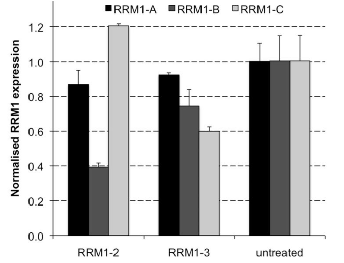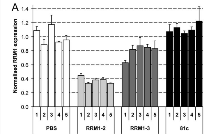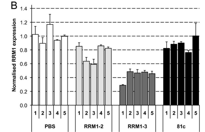 Apparent knockdown of RRM1 mRNA measured by RT-qPCR following intratumoural injection of siRNA. A549 xenograft tumours were injected with PBS, RRM1-2, RRM1-3 or non-targeting siRNA (81c) (n = 5). RRM1 mRNA was measured by real-time RT-qPCR. PCR was carried out with primers flanking the RRM1-2 (RRM1-B, shown in (A)) or RRM1-3 site (RRM1-C, shown in (B)).