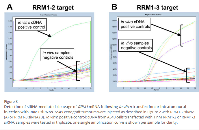 To explore this possibility, we investigated the effect of adding siRNA to the real-time qPCR step (Figure 5). We used cDNA reverse-transcribed from RNA isolated from the tumour of a PBS-treated mouse as template for real-time qPCR, and measured the effects of adding increasing amounts of various siRNAs. As shown in Figure 5A, PCR with the addition of RRM1-2 siRNA at high (50 to 200 μM) concentrations led to inhibition of RT-qPCR, but only when the primer pair flanking the target site (RRM1-B) was used. In contrast, there was no effect on the RRM1 mRNA levels measured in the presence of either RRM1-3 or ApoB-specific siRNAs.