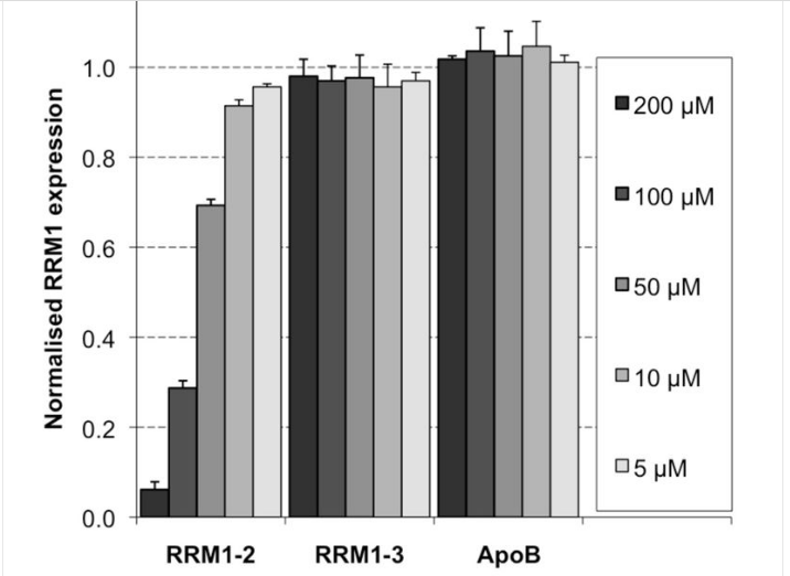 RNA was isolated using the PureLink 96 RNA Purification system (Invitrogen), with an additional Trizol (Invitrogen) extraction for in vivo samples, quantified via spectrophotometry using a Nanodrop (Thermo Scientific), and first-strand cDNA synthesised using Superscript III polymerase (Invitrogen), as described [12]. For real-time qPCR, the cDNA was diluted 1:4 in 10 mM Tris pH 7.0, with reactions carried out on a LightCycler 480 (Roche) using SybrGreen I Master mix (Roche) and gene-specific primers at 180 nM (Table 1) in 384 white multi-well plates [12]. Primer sets specific to different regions were used to measure RRM1 mRNA, as depicted in Figure 1. Melting curve analysis was performed to confirm that a single product was being amplified, and the products were run out on agarose gels to confirm their predicted amplicon size (data not shown). For competition experiments, the indicated concentrations of siRNAs or RNA oligonucleotides were added to the RNA or cDNA templates prior to reverse transcription or PCR, respectively. Levels of RRM1 mRNA were normalised to the reference genes LMNA or HMBS, with ApoB normalised to Polr2a for mouse samples, and relative change in mRNA levels following treatment with specific or control siRNA was calculated from triplicate technical replicates of each using the 2-ΔΔCt method [13]. RNA, tumour and cell samples were all stored at -80°C, whilst cDNA was stored at -20°C. Positive controls for RT-qPCR using cDNA prepared from an A549 in vitro culture showed % CV of < 1.1 for all human primer sets between assays, whilst intra-assay variation was < 1% for human primers, and < 2% for mouse primers.