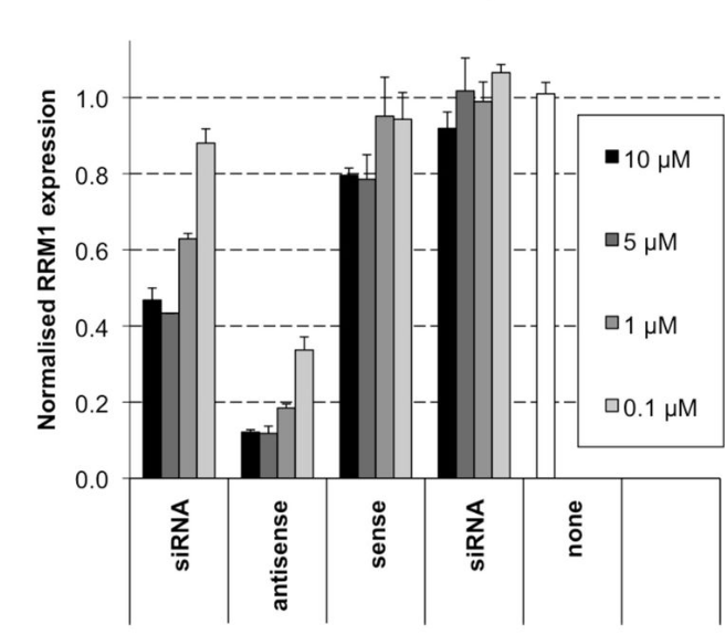 The apparent knockdown of RRM1/Rrm1 in tumours following intratumoural injection of siRNA was found to relate to the primer pair used in real-time RT-qPCR, in contrast to the similar levels of knockdown measured in vitro after transfection with three different siRNAs, irrespective of the primer pair used in RT-qPCR. This suggested that the residual siRNA was interfering with subsequent steps in the analysis, perhaps explained by the concentration of siRNA in the RNA isolated in each system. The method of RNA isolation used in this study involves binding the RNA to a size selection column, which should exclude small RNAs less than 90 bp. However, miRNAs have been isolated using this procedure [15] suggesting that the columns only reduce, but do not exclude, small RNAs.