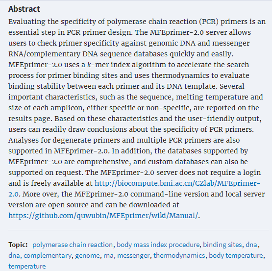 Here, we introduce MFEprimer-2.0, a fast and thermodynamics-based PCR primer specificity-checking program, representing a significant update of our previous work, MFEprimer (6). New features in MFEprimer-2.0 include the following: (i) the use of the nearest-neighbour (NN) model (9) rather than the NCBI BLAST program to evaluate binding stabilities between a primer and its binding sites; (ii) a k-mer index algorithm to significantly accelerate the binding-site search process; (iii) a redesigned homepage and results page to improve the user experience; (iv) support for degenerate primer analysis; (v) support for multiple databases for cross-species PCR primer assays and (vi) post-analysis of the predicted amplicons, for example, the “MultiAlign” function, to check for similarities among the predicted amplicons.
