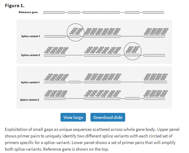 Despite the rising interest in studying the role of alternative splicing in inducing proteomic diversity, only few studies (16–20) have addressed isoform-specific expression profiling of alternatively spliced genes. The main reason for this is the difficulty in precise amplification of individual splice variant of a particular gene, especially when information about the gene’s isoforms is lacking. This bottleneck can be overcome by identifying their unique binding positions for primers with high specificity. First, such a design will enable a researcher to amplify isoform transcripts on a genome-wide scale using tools like quantitative real-time reverse transcription polymerase chain reaction (qRT-rtPCR/qRT-PCR). Second, it is applicable to duplicated genes in redundant genomes, common in agronomically important crops. Third, it bypasses a manual search for isoforms, making it an efficient, user-friendly and less error-prone process.