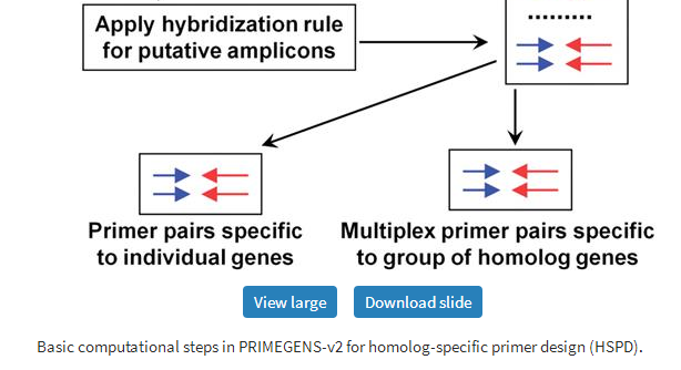 After this step, the primer pair pool generated gets further reduced to retain only those primer pairs that result in potentially good amplicons with no or few cross-hybridization. Out of these final candidates, the top primer pair(s) having no or the least amplifiable primer-pair products in the whole genome is reported as the final output. Figure 3 shows the basic flowchart of major computational steps. Primer pair combinations can then be manually verified and selected based on the target gene attributes such as splice variants and duplicates. The design provides detailed information about all primers such as their start and end positions on query sequence; number, names and sizes of all potential amplicons; and melting temperatures and GC contents of both forward and reverse primers. Manual verification adds another layer of confidence but the user has the option of by passing this and instead selecting top primer pairs provided by PRIMGENS-v2. Selection can also be made based on the design purpose. For example, whether an isoform has to be uniquely amplified or a pool of isoforms needs to be amplified.