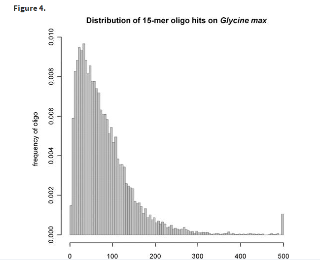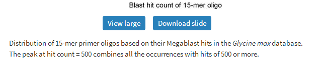 In order to estimate the complexity of finding sequence-specific primer pairs, we randomly chose approximately 26 000 15-mer oligos derived from more than 100 000 oligos designed as primer for various exonic regions from the soybean genome. The uniqueness of these 15-mer oligos was checked against the Glycine max database, which contains 77 778 sequences, using Megablast. Figure 4 shows the distribution of oligo hit counts on the Glycine max database, where vast majority of oligos show more than two hits, with only seven out of 26 331 hitting once and only 15 giving two hits. The peak in this plot corresponds to oligos that give 30–40 hits on the Glycine max database. The large number of hits is mainly due to genome complexity of soybean. Soybean genome is a product of an ancient genome duplication event and multiple neo-polyploid speciation events imposed on its paleopolyploid genome. In addition, gene loss, gene silencing and rearrangement of the genome like inversion or translocations along with duplication events (41,42) further made the genome more complex and gave rise to unusually high number of similar sequence fragments within its genome.
