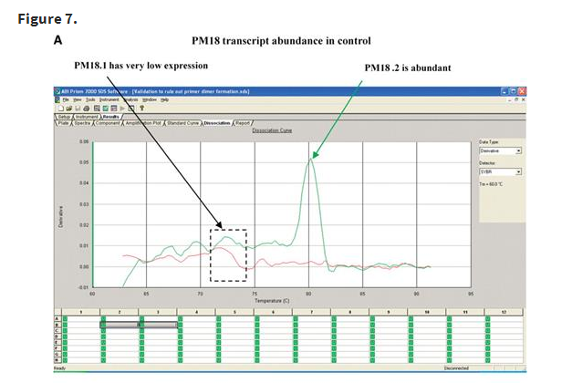 In this article, we present primers designed to amplify PM18 (Glyma03g34680), a member of the LEA family, as evidence for primer stringency, accuracy and specificity, as designed by PRIMEGENS-v2. Figure 7 shows two sets of primer pairs represented in green and red for PM18 gene. One of these primer pairs (shown in green) loaded in well B3 was capable of amplifying both splice variants of the gene PM18 (PM18.1 and PM18.2; Glyma03g34680.1 and Glyma03g34680.2), while another primer pair (shown in red) in well B2 could uniquely amplify PM18.1. The curves represent two wells that use different primer sets for the two PCR reactions on cDNA synthesized from the control and ABA stressed samples. A smaller peak at a lower Tm in Figure 7A is a result of very low transcript abundance. In Figure 7B, where primers were designed to detect more than one form as represented by the green curve, the peak is still sharp, with a second peak at a lower temperature. This second peak is easily distinguishable from that in Figure 7A due to its height, which is directly related to the abundance of the amplicon. From this, we can conclude that PM18.1 has very low expression in Figure 7A and that its expression is enhanced when the plant is stressed with ABA (as seen in Figure 7B). However, PM18.2 expression in stress is comparable to that in the control. By comparing between Figure 7A and B, we can clearly rule out primer dimerization as a result of low transcript abundance in Figure 7A. Taken together, the curves genuinely reflect transcript profiles and hence, primer specificity.