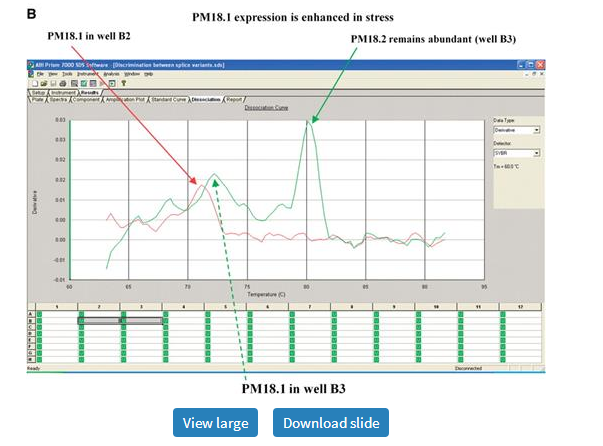 Dissociation curves for PM18 transcript in the control and ABA-treated samples showing primer specificity. Red and green curves represent amplicons generated by two different sets of primers. (A) PM18.2 is abundant in the control condition (green arrow). The small, red and green peaks in the dashed box indicate comparatively low abundance of PM18.1. (B) Both PM18.1 and PM18.2 are expressed in the ABA-treated samples. Curves represent amplicons derived from primer pairs designed to amplify PM18.1 (red arrow) alone in well B2 or both PM18.1 (dotted green arrow) and PM18.2 (solid green arrow) in well B3. The similarity of PM18.1 peaks within (A) or within (B) indicates primer stringency.