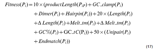 Based on the several primer design constraints described above, the fitness of each particle is evaluated by the fitness function. A low fitness value means that the particle fits more constraints. The default fitness function can be written as: